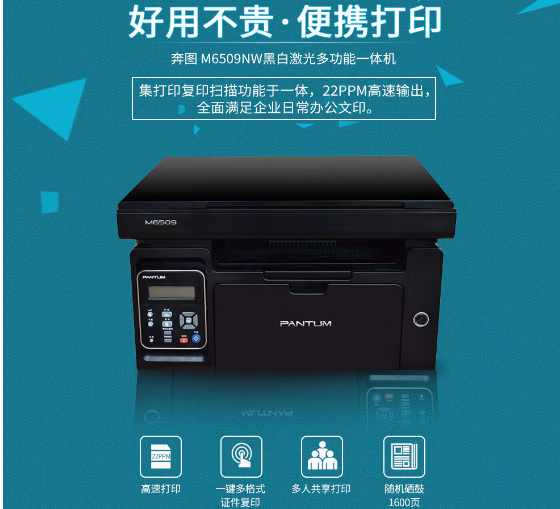 奔图(PANTUM) M6509NW A4黑白激光三合一多功能一体机(22ppm+USB接口+无线WiFi打印+有线网络) 打印机