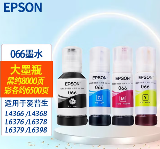 • 商品名称:爱普生(EPSON) 066原装墨水,适用于爱普生L4366 L4368 L6376 L6378 L6379等打印机 爱普生066原装墨水 四色一套