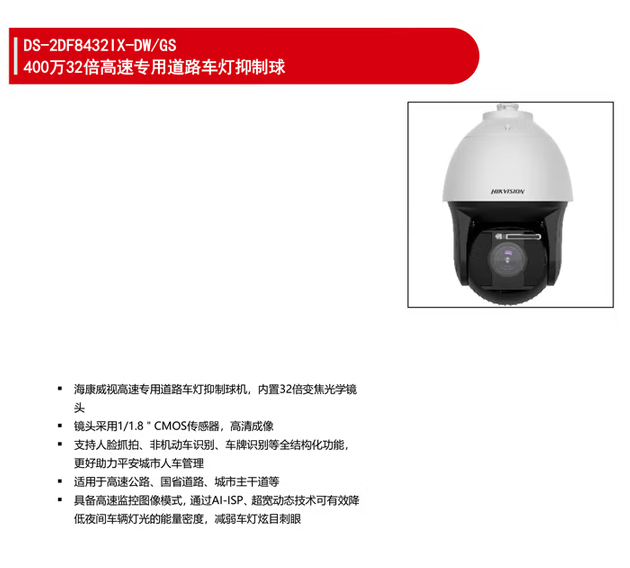 海康威视(HIKVISION) 智能球型摄像机400万32倍高速专用道路车灯球机DS-2DF8432IX-DW/GS