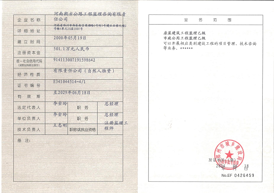 持有河南省交通运输厅颁发的公路工程乙级监理资质证书