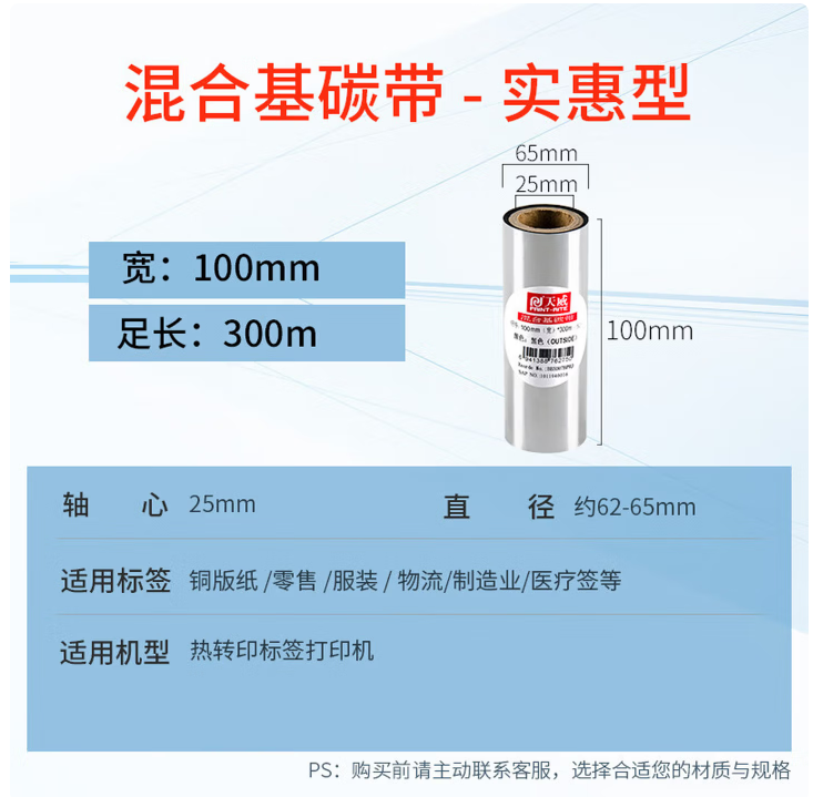 天威(PrintRite) 混合基碳带卷100mm*300m 标签机条码机热转印打印机色带